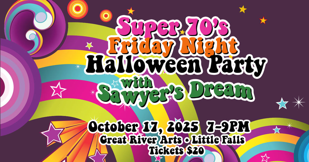 Break out your bell bottoms and floral prints and join us at Great River Arts in downtown Little Falls for everything 70s Halloween Party with Sawyer's Dream! Dress up in your best 70s costume for the Halloween Costume Contest and dance to the band's 70s inspired signature sound. This night is sure to be a blast filled with fantastic music, prizes, guitar raffle, free treats and a singles mingle!